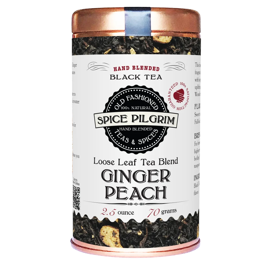 Our Ginger Peach blend marries the sweet fruitiness of peaches with the warm spice of ginger over a base of smooth black tea.
